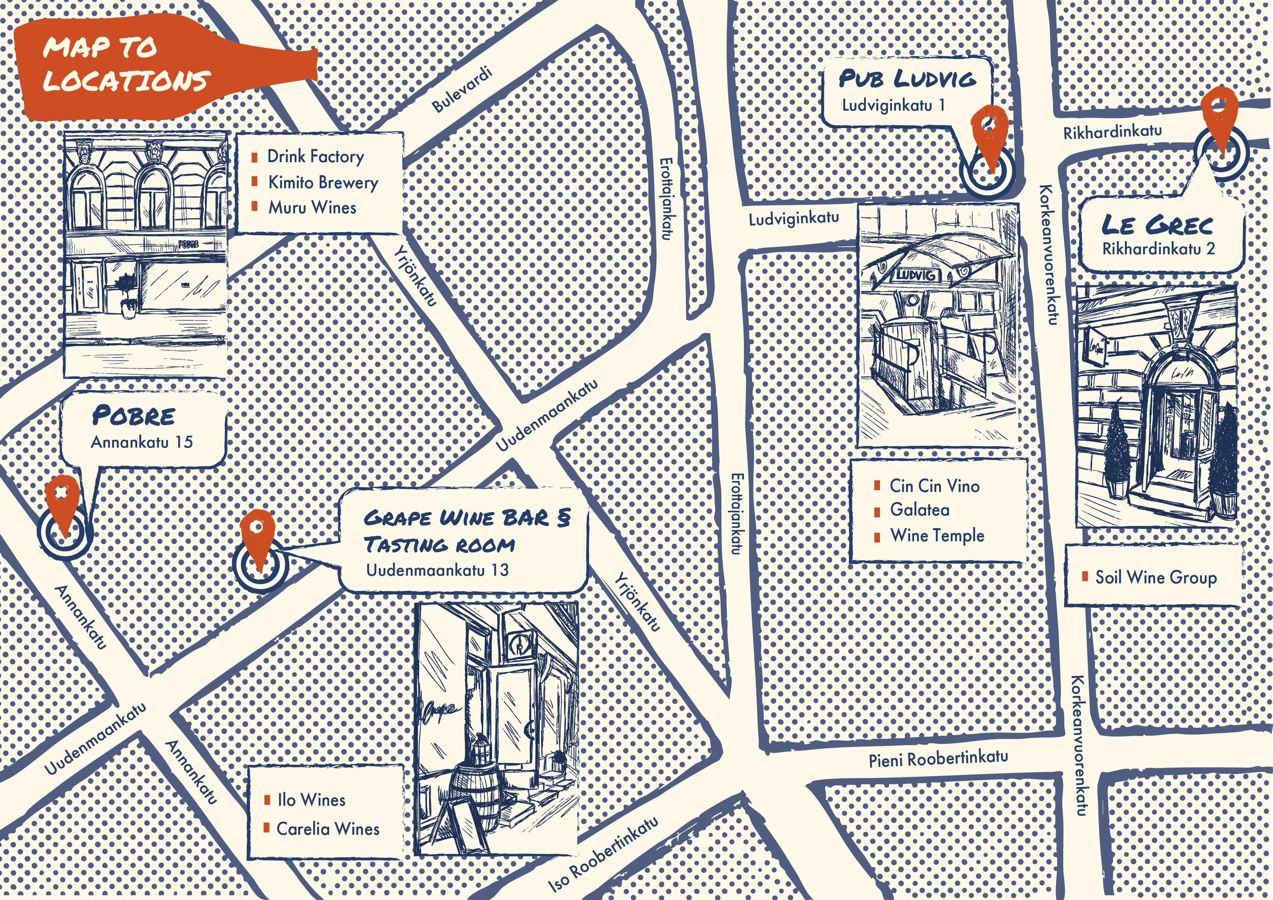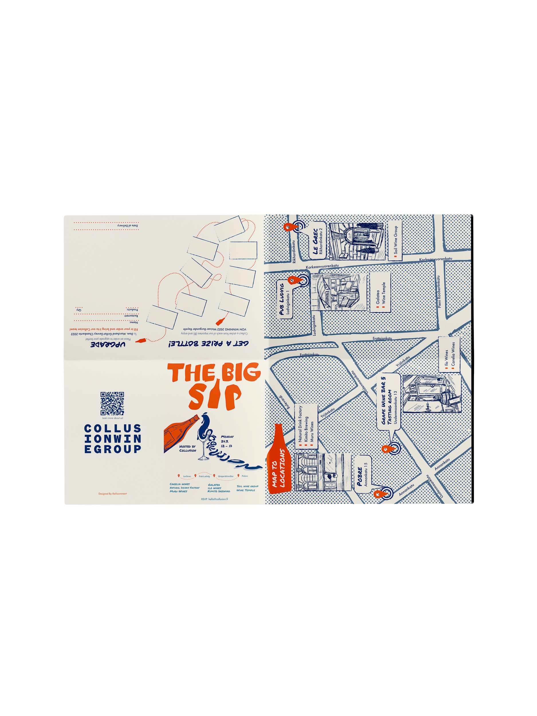 I designed the visual identity for a large wine tasting event organized by Collusion Wine Group, a Finnish wine import company representing eight independent importers. The project included the event poster, a venue map, and an informational A2-sized flyer with event details.